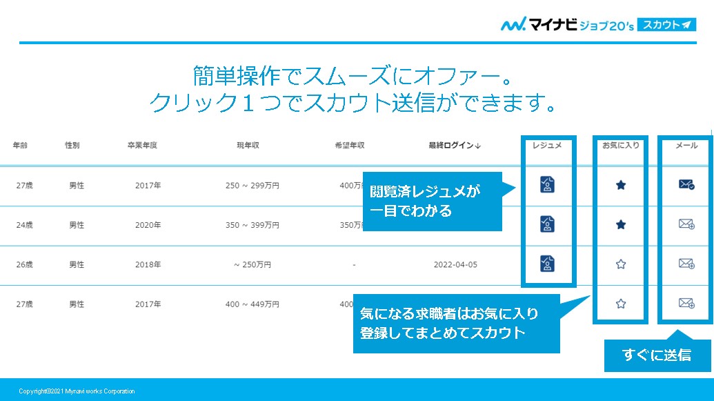 私が新卒採用を担当していた時に大変役立ちました。特に印象的だったのは、ある時、我々が探していた特定のスキルセットを持つ新卒者を見つけることができたことです。その候補者は、我々が提供する独自の研修プログラムに非常に興味を持っており、最終的には我々のチームに加わりました。このようなマッチングの成功は、マイナビジョブ20’sスカウトのおかげでした。