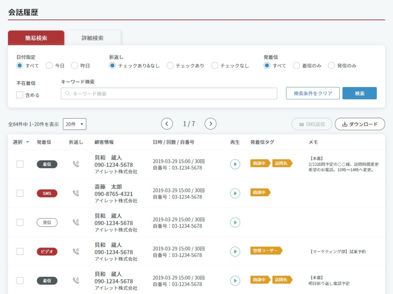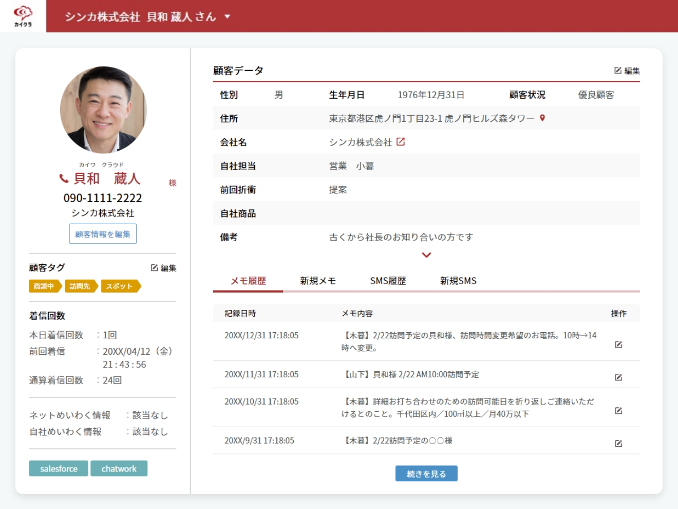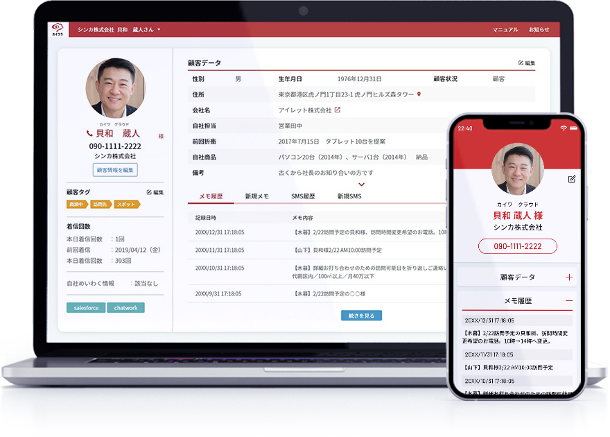 ・通話履歴・SMS履歴・DM履歴など、顧客とのやりとりを一元管理