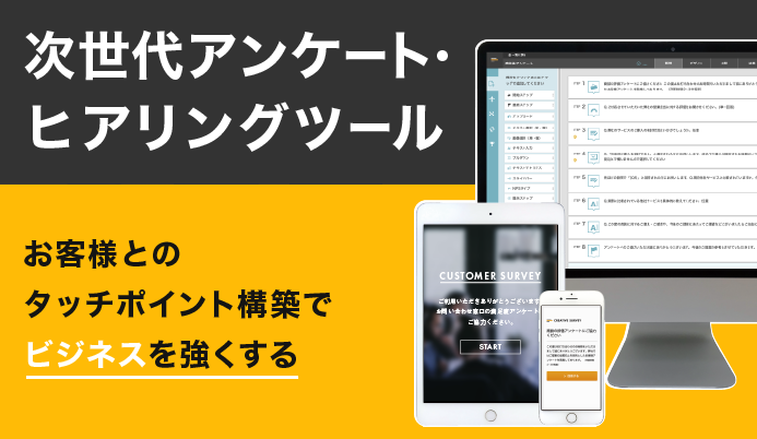 法人向けのWebアンケート・ヒアリングツールです。オンライン時代の新しいコミュニケーションツールとしてのご活用が増えております。
