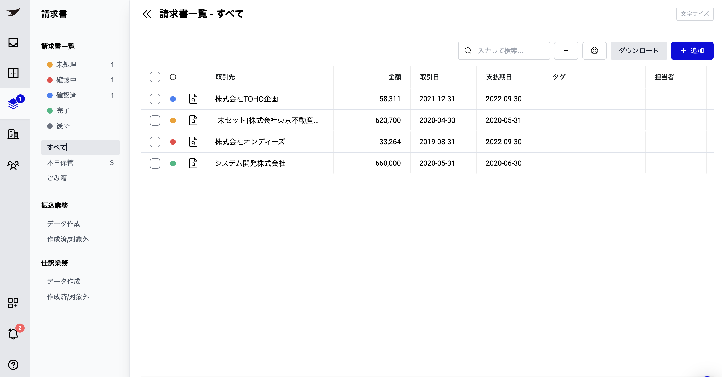 請求書・契約書・納品書・領収書などの国税関連書類をアップロードすると、電子保管に必要な項目をAI OCRが自動でデータ化して、検索に必要なタグをつけてくれます。台帳管理などにありがちな、ファイル名などを一つひとつ入力したり、キャビネットを漁ったりする手間が省けます。