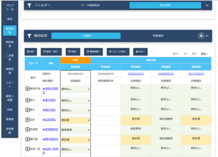 健診、ストレスチェック、残業時間、など健康情報のデータを一元管理できます。