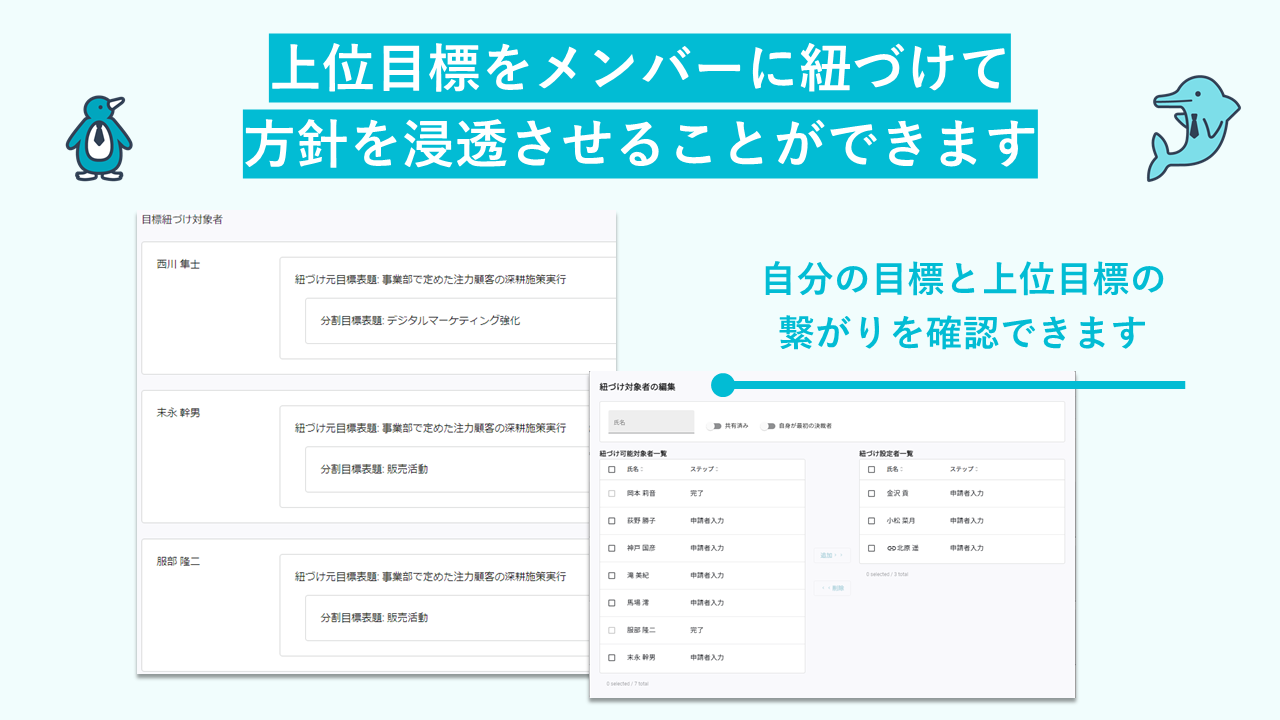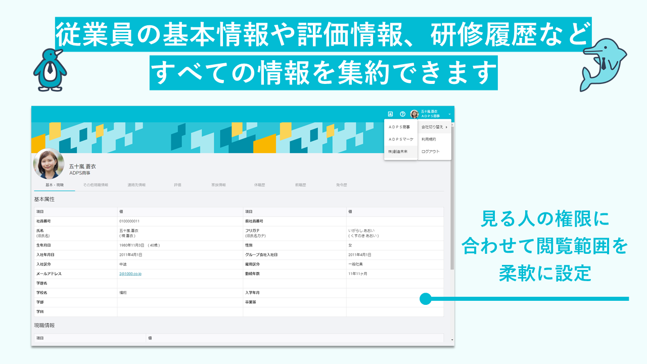 【Hito-Compassでできること】 ■社内の人財情報を閲覧・検索できる ■組織目標の達成にむけて、目標設定と進捗管理の質を改善 ■人事統合システムADPSと自動連携し、最新人財情報を常に把握できる