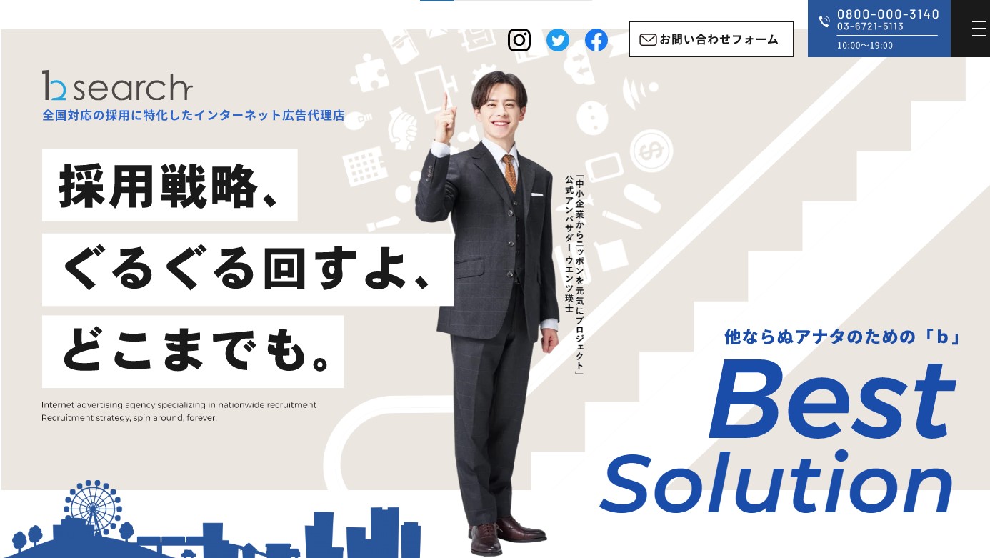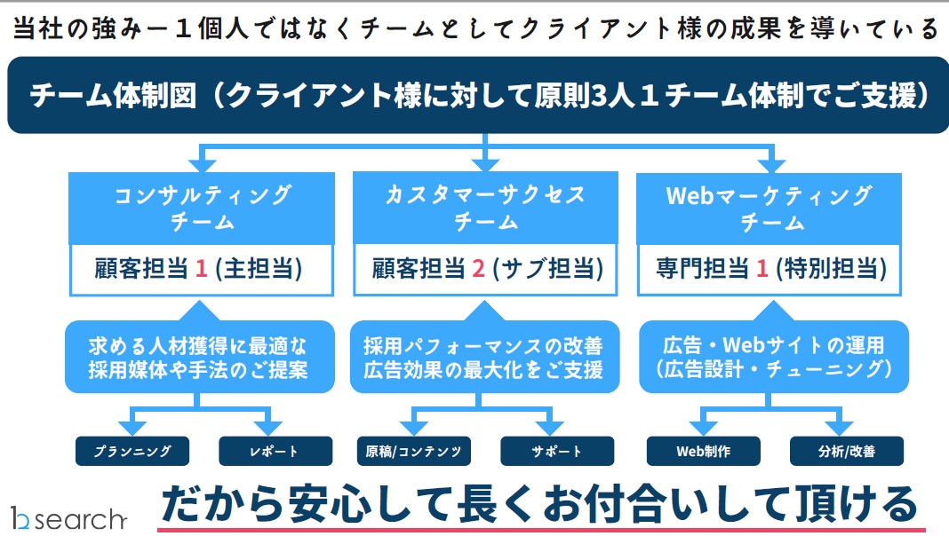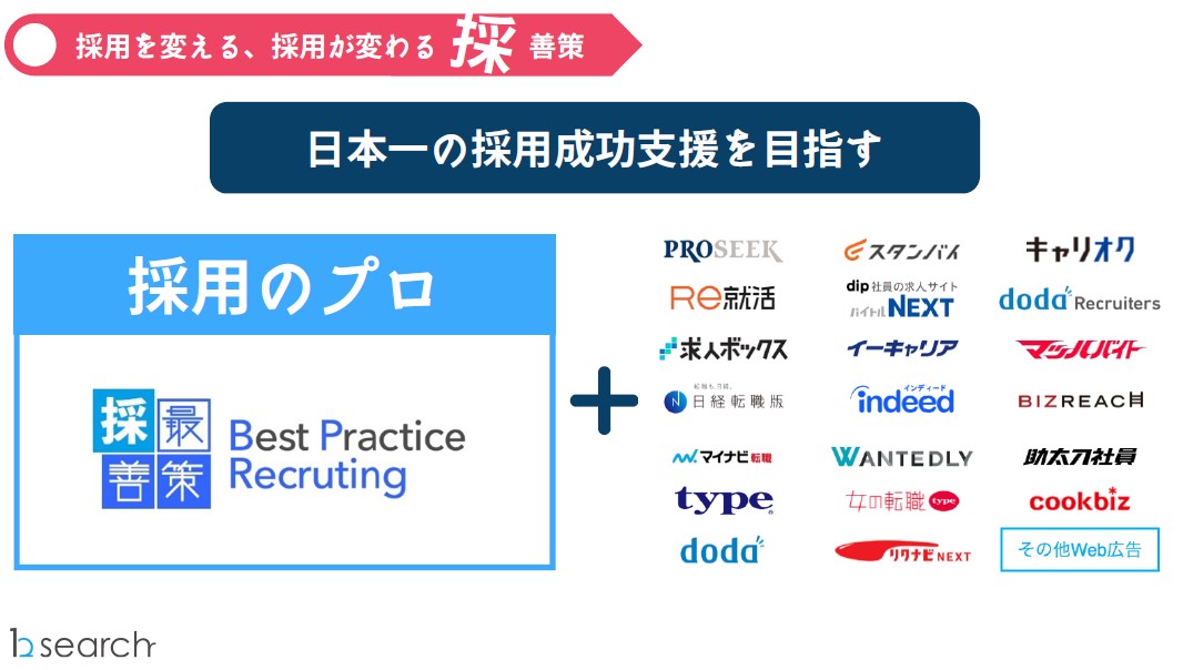 なんのために人材採用がしたいのか?という本質に向き合って、あらゆる媒体を駆使しながらお客様の採用戦略を支援。採用は上がったり下がったり、沢山のドラマがあります。なるべく効率よく。そしてワンストップで解決できるように、bサーチはこれまでの実績とノウハウを元に沢山のサービスを提供いたします。