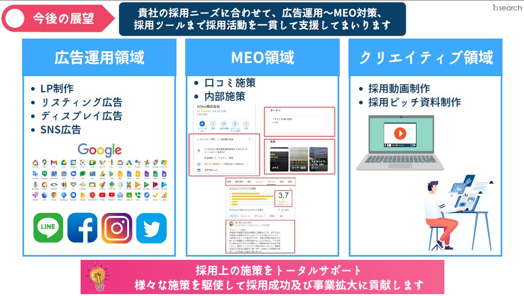 デパートのように沢山のサービスを提供し、効果と未来のために、何度も戦略を立てる。ただ求人広告を出稿して終わり…ではなく、その先の業績向上に向けた人材育成にいたるまで。