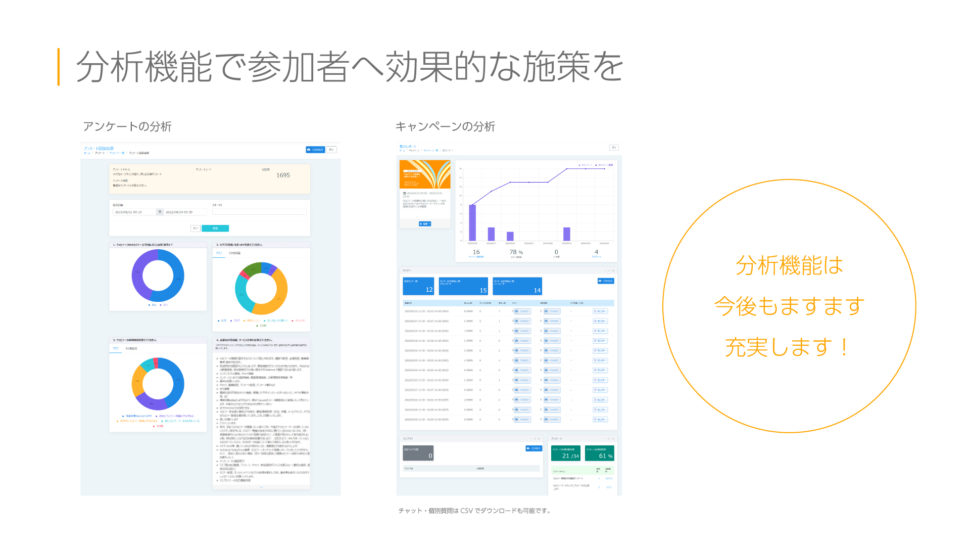 ウェビナー開催・動画配信・イベント管理までを一つのプラットフォームで完結。メール配信やアンケート、チャット、ライブ投票などのオプション機能も充実しているため、イベント運営が格段にスムーズに。複数のシステムやツールを使い分ける手間から解放され、社内の業務負担を大幅に削減。本来注力したい“成果につながる企画づくり”に時間とリソースを集中できます。