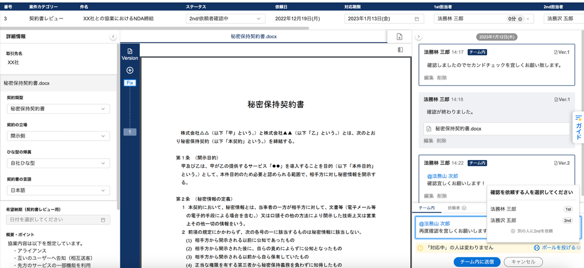 法務相談から契約締結までをクラウドで一元管理。散在する情報やバージョン履歴を集約し、チームで見える化。属人化を解消し、やりとりのヌケモレを防ぎます。これにより、判断・対応スピードが向上します。