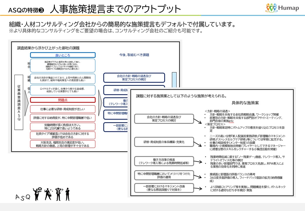 実態の結果だけでなく、組織人材コンサルティングの視点より施策提言まで含めたパッケージのため