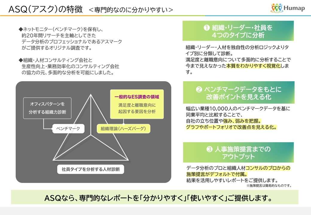 20年以上のリサーチ専門のアスマークと組織人材コンサルティング会社と業務効率化のコンサルティング会社の多面的な分析ができる調査です。 ①組織・リーダー・社員の4つのタイプ別診断 ②1万人のベンチマークデータと比較 ③人事施策提言までのアウトプット