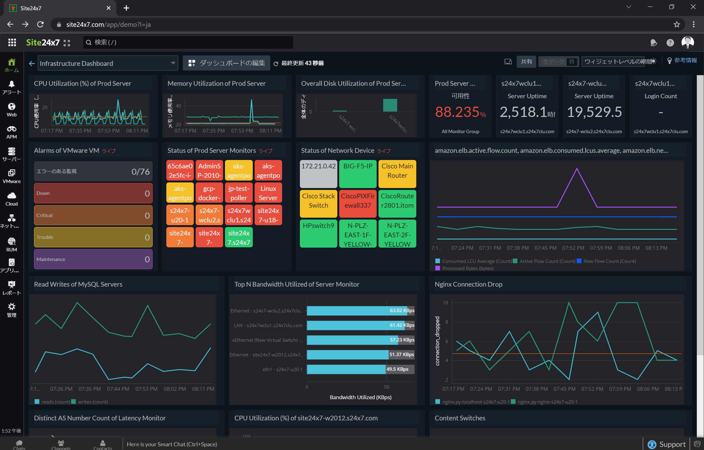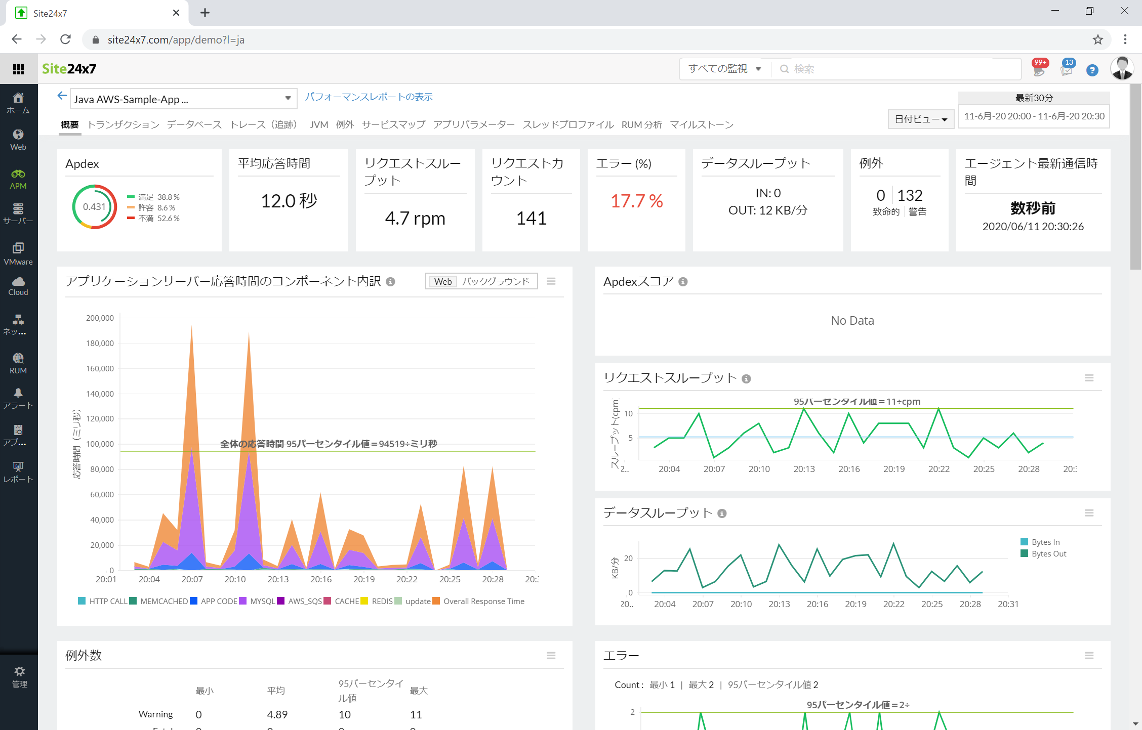 Site24x7は、従来のAPMツールと比べて低コストで導入できるSaaS型APMツールです。アプリケーションパフォーマンス管理機能に加え、外形監視機能、サーバー監視機能も搭載しています。 Python・Java・PHP・Rubyなどで開発されたアプリケーションの遅延のボトルネックをトランザクションやコンポーネント単位で特定できるようになります。 また、リアルユーザー監視機能で実際のユーザーが体感している応答時間を監視し、Apdexスコアでユーザー満足度を点数化するため、ユーザー視点かつリアルタイムでパフォーマンスの低下を把握し、その原因の特定までを短時間で実施できます。 すべての機能をいつでも無料で試せるので、気軽に利用を開始できるのも特徴のひとつです。