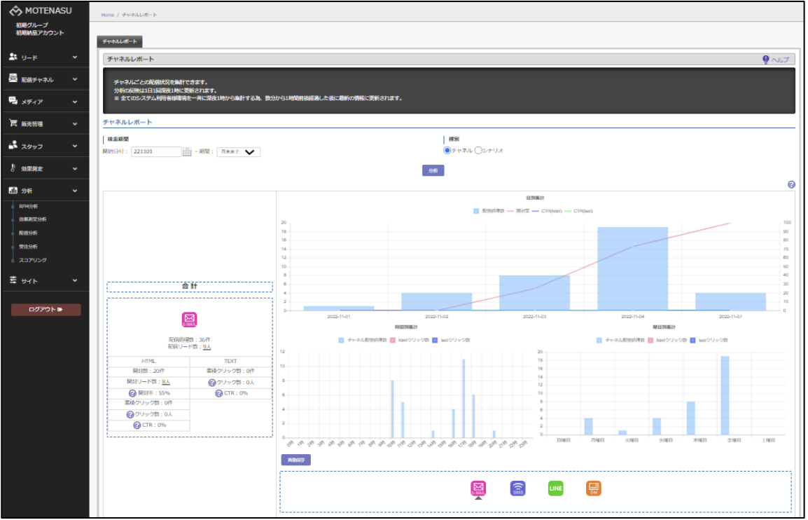 ■効果測定で顧客化 配信分析機能を使い、配信されてからの開封率や記載URLのクリック率を分析します。 分析結果をもとに開封者がその次のステップに進まなかった場合に別のチャネルでのアプローチに変更ができたり、訴求内容を見直したりと、 改善につなげていくことができます。 また、配信分析は「チャネルごとの分析」、「シナリオごとの分析」が可能です。