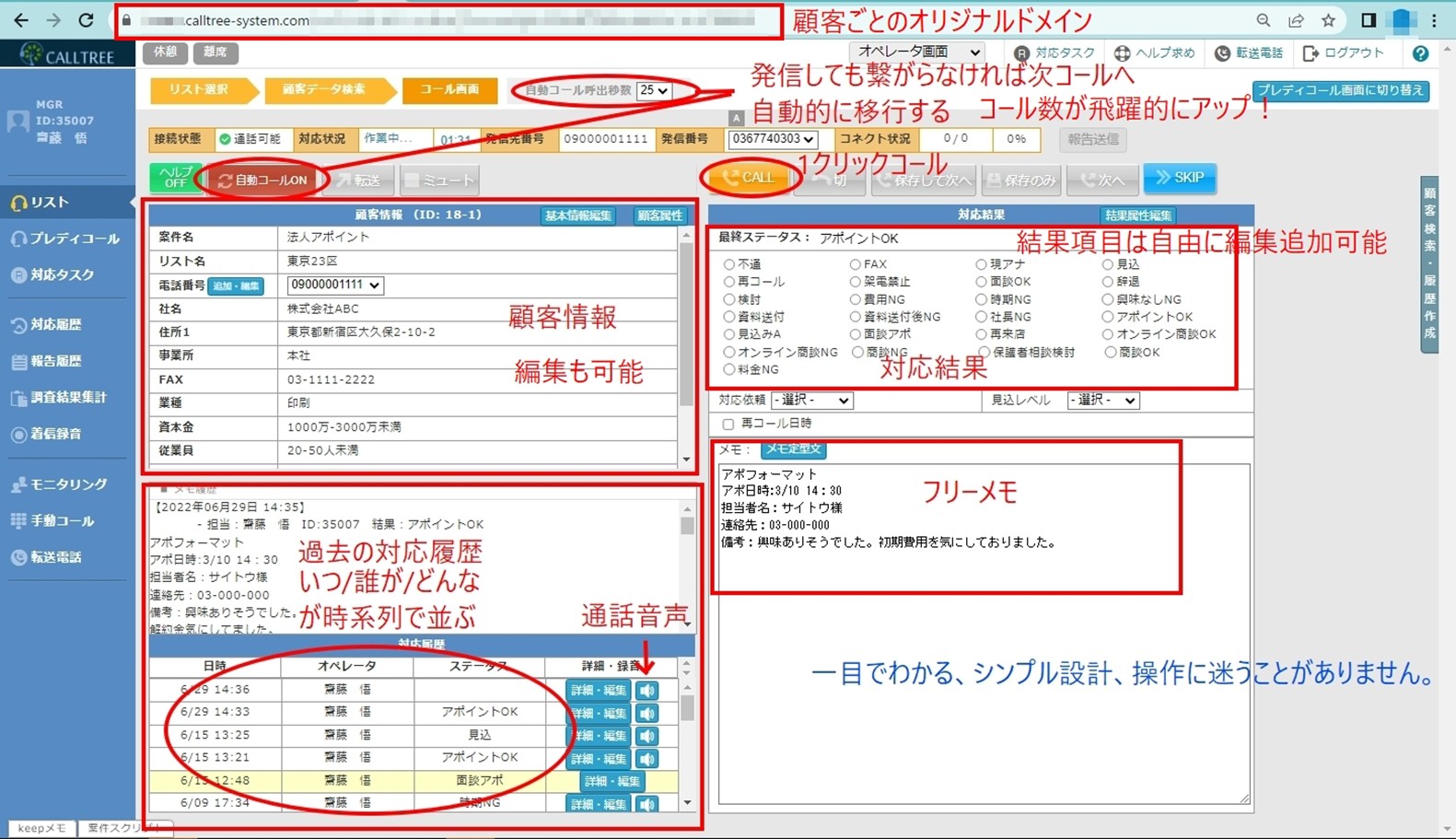 顧客を検索する際、再コールが必要な場合にはその予定をリマインドしてくれるなど、細かな機能がとても使いやすく、助かっています。自動的に電話の内容を録音してくれる機能もありがたいです。