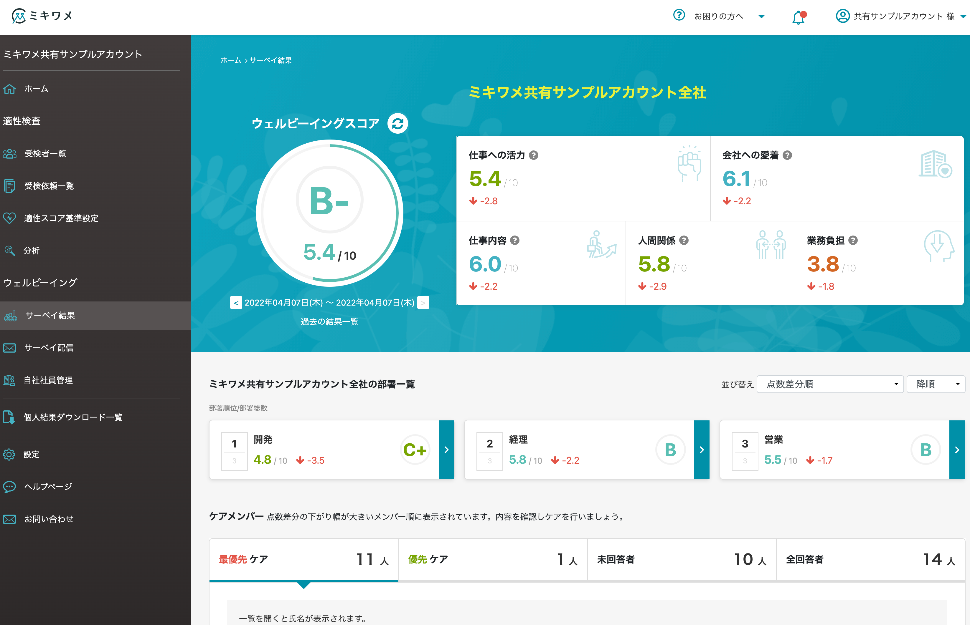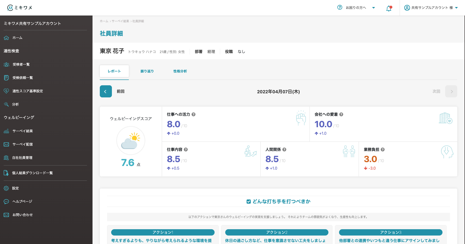 「ミキワメ ウェルビーイングサーベイ」は、 社員の性格と心理状態を元に、サポートが必要な社員を可視化します。 また、社員に合ったマネジメントやケアの方法をAIが提示します。 結果的に、エンゲージメントが向上し、離職・休職を防ぎます。 1ヶ月の無料トライアルも実施中です。