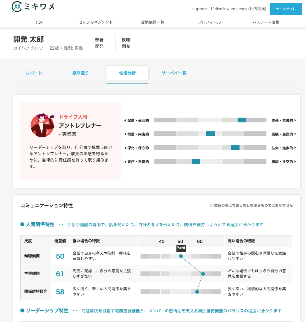 A まずは貴社の従業員に性格検査を受検いただくことで、会社全体の傾向がわかります。候補者の結果と会社全体の傾向を比較することで、候補者のマッチ度がわかります。 さらに企業全体の傾向だけでなく、モデルにしたい社員に絞って性格特性を分析することで、候補者が「自社で活躍する人材」かどうか見極められます。Q 検査時間はどのくらいですか?