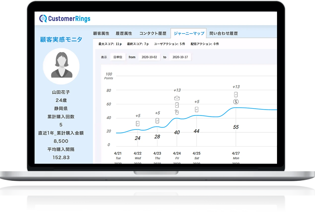 顧客データの統合・多彩な分析・メール、LINE、アンケートなどのアクションに取り組めるCRM/MAツールです。業務効率化だけではなく、LTV向上に必要な「顧客理解」を深める機能や、施策改善の運用まで意識した機能が豊富に実装されています。