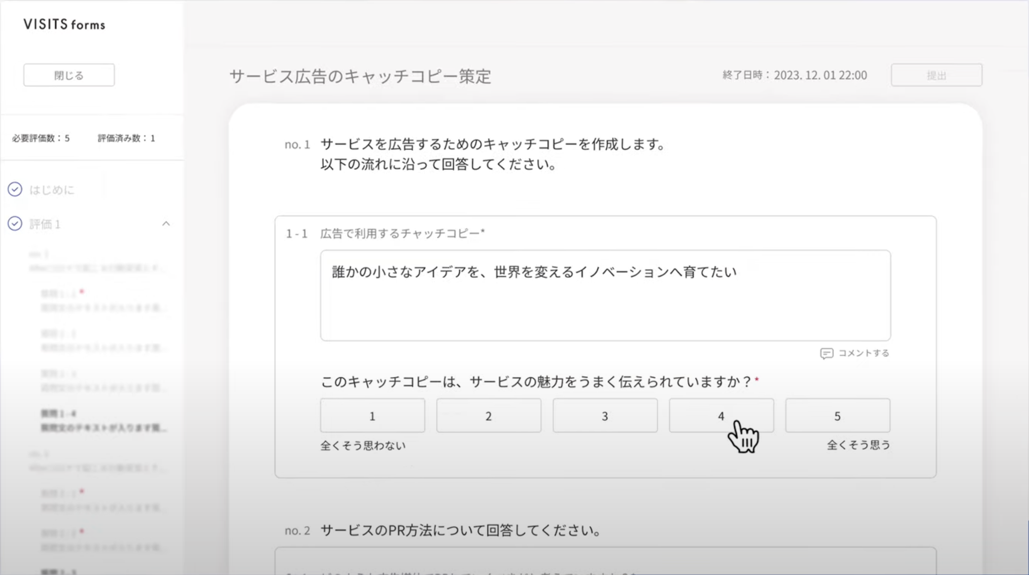 ▼これまでアナログで属人的に行われてきた 意見の取りまとめをDXし、意思決定の精度を向上 ❶ 網羅性の高い多様な意見を 短時間で収集し、情報整理可能 ❷ 全てオンラインで完結でき、圧倒的工数削減を可能に ❸ 一ヶ月の無料トライアル実施中! ▼VISITS forms」は会議を抜本的に変革し議論の生産性を向上させる <会議における課題> 課題①:非効率な会議による企業損失 課題②:人数が増えても効率化しない会議 【これらを同時に解決できる意思決定支援ツール】 ▼多様な価値観に触れることで学びを深める 相互学習プラットフォームとして活用可能 課題①:オンライン(eラーニング等)でインタラクティブなセッションを行うのが難しい     ➡︎リアルに近いインタラクティブ性を実現 課題②:発表者やフィードバック者の心理的安全性を担保できない     ➡︎匿名システム 課題③:時間内で全員が発表してフィードバックをもらう時間がない     ➡︎全員がフィードバックをもらえる仕組み 課題④:正解のない問題なのでアウトプットの良し悪しの判断が難しい     ➡︎CI技術による客観的スコア 課題⑤:(主にビジネスに関する)ノウハウが暗黙知として属人化していて共有されない     ➡︎暗黙知の形式知化および知見共有システム