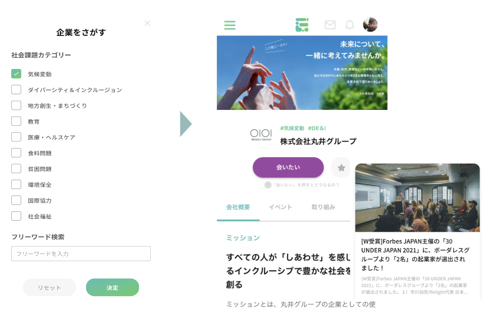 2021年5月のリリース後、掲載企業は120社、登録ユーザー数は13,000名を超えており、2024年2月には『エシカル就活』から『BaseMe』にリブランディングを行いました。これまで同様「社会課題」や「取り組みたいテーマ」を軸にしたマッチング創出を行いつつも、弊社の掲げる『人類の価値観を解放する』というビジョンの実現を加速すべく、スキルや経験に加え、より個人の価値観を軸に、企業や組織カルチャーとの本質的なマッチングを創出することを目指しています。