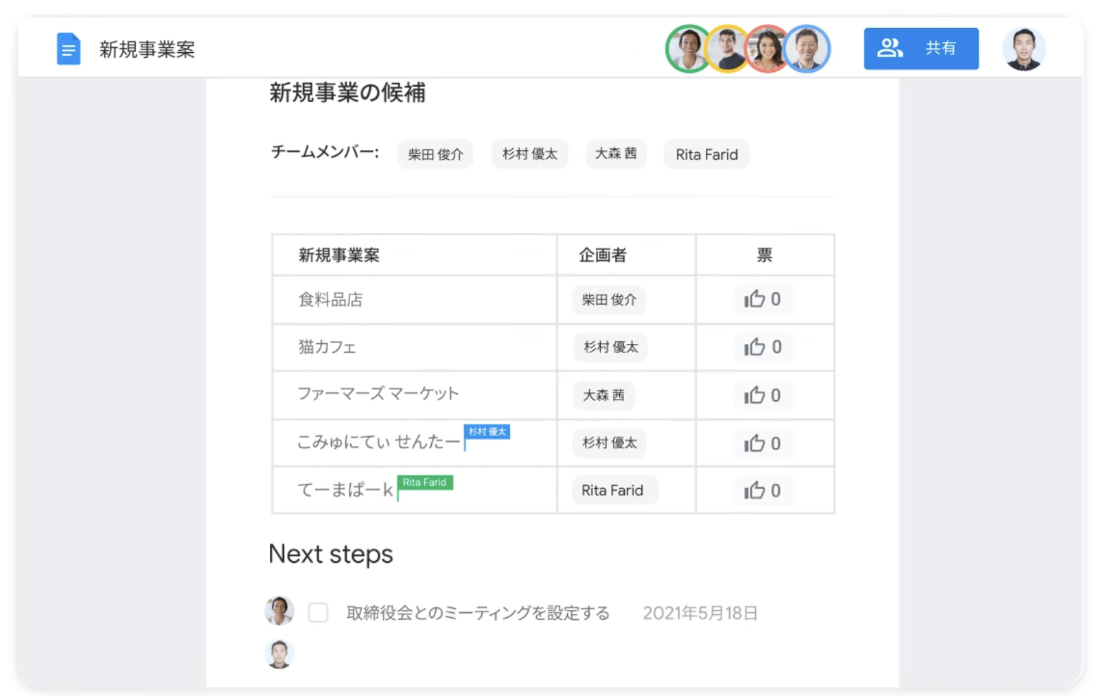 ファイル共有や共同編集もスムーズに行え、チームでの作業効率向上に役立っています。