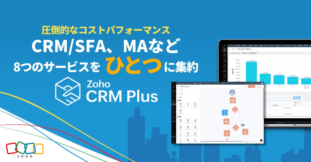 ■シンプル・低コストにMAを始めるなら【Zoho CRM Plus】 Zoho CRM Plus(ゾーホー・シーアールエムプラス)はシンプルなMA(マーケティング・オートメーション)機能からCRMやBI、ヘルプデスクまで、営業・マーケ・サポートで必要な8つの機能を1つにまとめたオール・イン・ワンパッケージです。圧倒的なコストパフォーマンスで顧客中心のマーケティングを実現します。 ==Zoho CRM Plusに含まれる8つのツール== ①CRM/SFA (Zoho CRM) ②【MA】メール配信 (Zoho Campaigns) ③【MA】Webトラッキング (Zoho SalesIQ) ④ヘルプデスク (Zoho Desk) ⑤SNSマーケティング (Zoho Social) ⑥タスク・プロジェクト管理 (Zoho Projects) ⑦オンラインアンケート (Zoho Survey) ⑧BIツール (Zoho Analytics) ====================== ■■Zoho CRM Plusはこんな課題を解決します■■ ●マーケティング部門 『製品に興味を持ってくれている顧客に対して施策を打ちたい・マーケティング業務を効率化したい』 ⇒ ・Webトラッキングによるスコアリングで見込み顧客の興味度を可視化 ・シナリオによるステップメールの自動配信 ・複数SNSの一括管理 ●営業部門 『顧客の検討状況が把握できていない・どの顧客に優先的にアプローチすればいいかわからない』 ⇒ ・CRM/SFAによる見込み顧客や商談の管理 ・プロジェクト管理ツールによるタスク管理 ・BIツールによる受注傾向の分析 ●カスタマーサポート 『サポート対応の質を上げたい・顧客満足度を高めたい』 ⇒ ・顧客の閲覧しているページを把握しオンラインチャットサポート ・アンケートによる顧客の声の収集 ・ヘルプデスクによる対応漏れの防止・対応状況の可視化