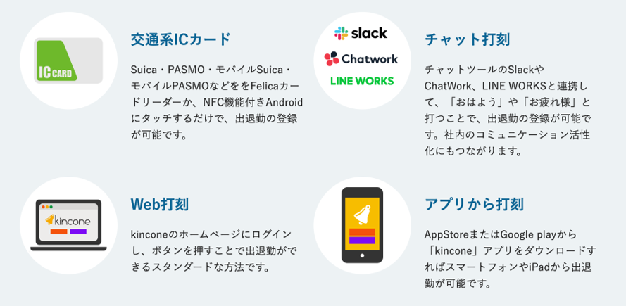 キンコンは豊富な打刻機能を備えており、従業員の働き方に応じて最適な方法を選択できます。ICカード打刻に加えて、モバイルアプリやWebブラウザからの打刻、さらにはSlackやChatworkなどビジネスチャットを使った打刻にも対応しています。