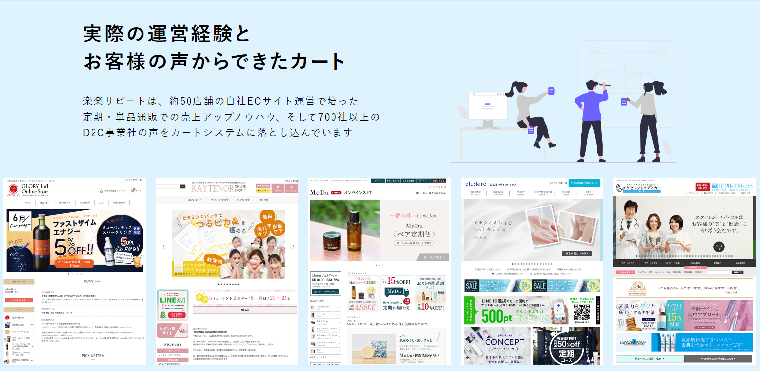 自社で約50店舗のECサイト運営を行い培った売上向上ノウハウと、700社以上のD2C企業から寄せられた要望を製品設計に反映して開発されており(※)、定期購入ビジネスに特化した実践的な機能群を備えています。